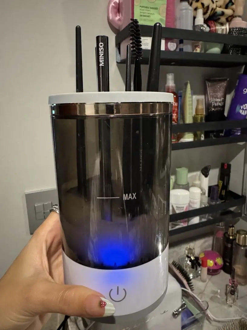Sí. Usa rotación a alta velocidad con agua y jabón suave, removiendo base, polvo, sombra y hasta corrector en menos de 10 minutos.